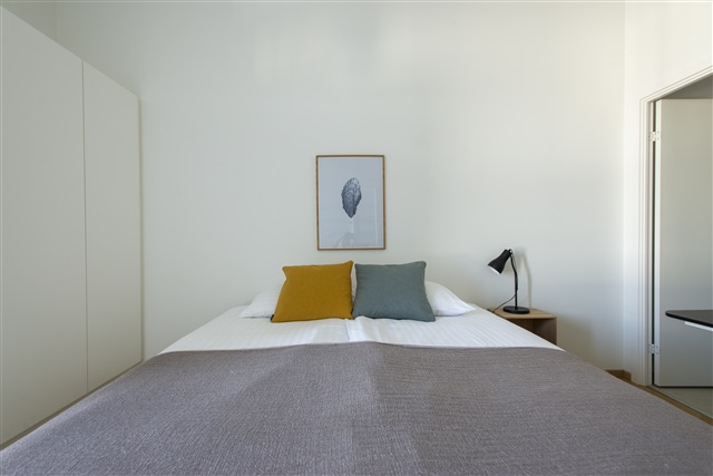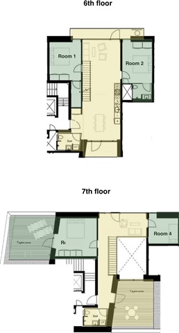 Situated on the sixth and seventh floors, this contemporary duplex penthouse, constructed in 2019, offers a panoramic perspective of the city. The residence features four bedrooms, accommodating two couples and two singles. The spacious and modern kitchen, equipped with a dining area, flows seamlessly into the living space, which is accentuated by extensive open window fronts. Residents can enjoy a generous rooftop terrace boasting stunning city views, alongside two additional balconies shared among occupants. The apartment includes a total of three bathrooms: two communal and one private.