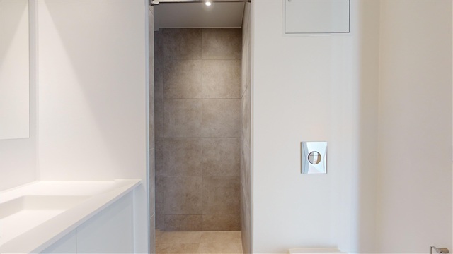 The bathroom is designed with white fixtures that create a refined and upscale ambiance. Both the floor and walls of the shower area are tiled in light grey Monte Carlo tiles, enhancing the bathroom's luxurious feel. Additionally, the bathroom is equipped with a washing machine and a tumble dryer.