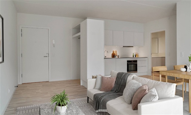 This desirable residence is situated in the newly developed Nærheden area of Hedehusene. Positioned adjacent to the green zone loop and within close proximity to both the Station and the main street of Hedehusene, Teglværkskanten offers a blend of apartments and townhouses. The building complex was designed by Sweco architects, with an emphasis on fostering community, access to open natural spaces, and time for family activities.The homes feature expansive window areas that allow abundant natural light to fill the interiors. Many units provide impressive views stretching across the neighborhood, while the penthouse apartments offer a unique vantage point from which the top of the ski slope in Hedeland Nature Park is visible. The townhouses and lower-floor apartments benefit from convenient access to a communal courtyard through their private terraces. Underfloor heating is standard throughout every home. Interiors include bright, open kitchens, tiled bathrooms with shower enclosures, attractive lighting details, and integrated laundry stacks. Ash wood flooring adds warmth and character. Skylights are installed in the townhouses to enhance natural illumination. The shared courtyard space invites residents to enjoy a relaxed atmosphere and encourages neighborly interaction. View the floor plan to understand the specific layout of each unit.