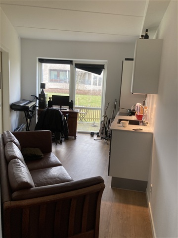 Located in the green surroundings of Egelunden in Aarhus, this contemporary apartment offers convenient proximity to the city center. The dwelling features high-quality materials throughout and is equipped with a full range of built-in appliances. The kitchen stands out with its elegant gray finish and includes integrated oven, extractor fan, ceramic glass cooktop, fridge/freezer, and dishwasher. Ideal for a single occupant, the residence also benefits from underfloor heating installed in every room and a Genvex ventilation system, enhancing overall comfort.The layout comprises a kitchen area with space for dining, one bedroom, and a stylish bathroom fitted with a combined washer and dryer. Constructed in 2020, the property grants access to a communal courtyard. For storage and convenience, there is a private storage room secured within a locked shed, alongside bicycle parking facilities. Additionally, residents can take advantage of designated free parking spaces on the premises upon registering their license plates.