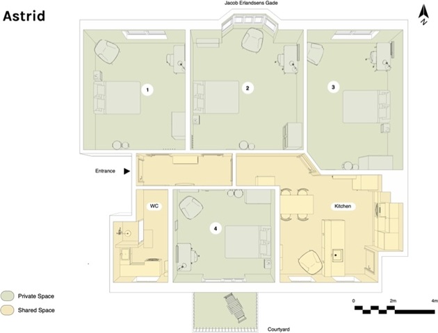 Situated in the heart of Østerbro, 'Astrid' is a recently refurbished apartment offering four spacious bedrooms. The apartment features an open-plan kitchen and living area, creating a unified and airy space. All rooms, including a contemporary bathroom, are accessible directly from the central hallway. Notably, the fourth bedroom benefits from a private balcony measuring 6 square meters, which overlooks the rear courtyard.Each bedroom comes furnished with a high-quality bed complete with bedspread, duvet, and pillows. Additional furnishings include a bedside table equipped with a reading lamp, as well as a desk paired with a desk chair and desk lamp. Ample storage is provided through hanging space and drawers for clothing, alongside storage boxes located beneath the bed. The rooms are further equipped with curtains, a mirror, a laundry basket, a trash bin, rugs, and various decorative elements.