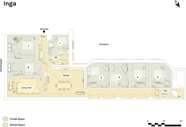 This apartment underwent a full renovation in 2022 and features seven bedrooms, including one designed for couples. It offers two communal bathrooms, a spacious contemporary dining kitchen positioned centrally, and an independent living room.Each bedroom is furnished with a premium bed complete with bedspread, duvet, and pillows. Accompanying the beds are bedside tables equipped with reading lamps. A desk area includes a chair and a desk lamp, alongside a comfortable lounge chair. Ample storage is provided through wardrobes containing drawers and hanging sections, as well as storage boxes placed beneath the beds. Additionally, rooms come with curtains, mirrors, laundry baskets, trash bins, rugs, and decorative items, although not all are visible in the photos.