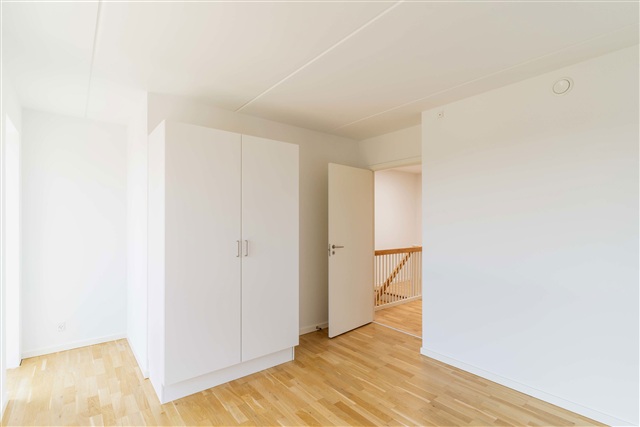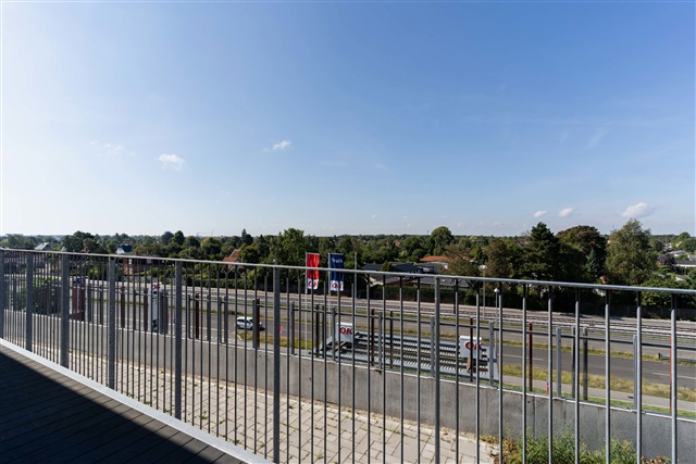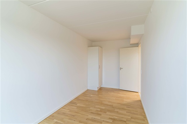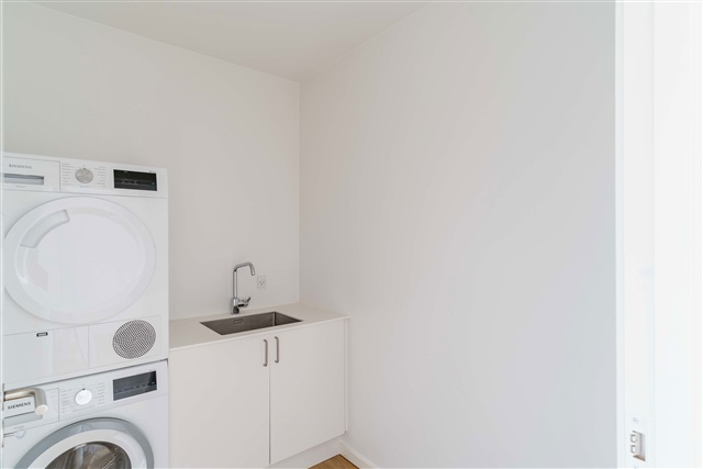 The rental apartments vary in size from 61 to 121 square meters, offering between two and four rooms. They are designed with a modern aesthetic, featuring adaptable layouts that include open kitchen-living spaces and built-in storage areas, typically separated from the bedroom, with an emphasis on practicality, natural light, and a cozy atmosphere. The residences are distinguished by high-quality finishes, such as oak slatted flooring with underfloor heating throughout all rooms, HTH kitchens equipped with Corian countertops, and standard appliances including a dishwasher, washing machine, and tumble dryer. Each unit benefits from either a private balcony or access to shared rooftop terraces and landscaped courtyard areas. Expansive windows ensure that all living areas and bedrooms receive ample daylight. Many of the apartments feature façades facing both the courtyard and the street, maximizing sunlight exposure throughout the day. Please note that the images provided are either visualizations or photographs of a model apartment and do not depict the specific unit available.