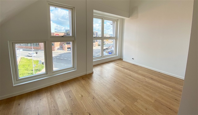 This exclusive apartment located in Skippergården offers a rare opportunity to own a home where design, quality, and location seamlessly combine. Situated with a captivating view over the Kolding River, the residence showcases meticulous attention to detail throughout. The space benefits from lofty ceilings and abundant natural light, primarily streaming in through elegant skylights fitted with convenient electric blinds.At the center of the apartment lies a sleek kitchen and dining area equipped with premium appliances, including a Gaggenau oven and a Quooker tap. From here, striking folding doors open fully onto a lovely balcony. This outdoor space is enhanced by a mechanical awning, a decorative self-watering plant wall, and scenic views of the river.