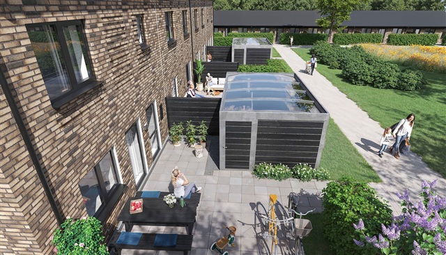 Outside, the property boasts both a terrace and a garden, inviting enjoyment of outdoor life throughout the year. Complementing this, there is a separate storage shed, bicycle parking, and a parking spot equipped with a charging station, ensuring the home meets the needs of contemporary family living.