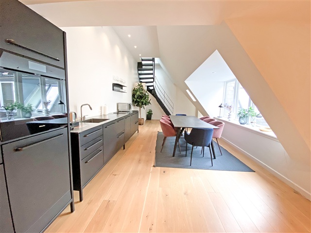 Situated in the very center of Copenhagen, this residence is surrounded by high-end shops, the iconic Kongens Nytorv, the bustling Magasin and ILLUM shopping centers, Nyhavn, Christianshavn, and convenient access to the Metro. Over recent years, this particular section of Strøget has experienced significant revitalization and enhancement. Found on the third floor, the apartment spans 214m2 and has been extensively refurbished from top to bottom.The layout includes a spacious entrance hall and a cozy living room offering scenic views over the pedestrian street Østergade and the charming historic buildings nearby. The kitchen, designed by Vipp, combines sleek aesthetics with practicality and features a dining area with a large table bathed in natural light streaming through expansive windows. There are three well-sized bedrooms, each equipped with double beds, alongside two bathrooms with showers and a compact utility room containing a washing column. It is important to note that the lease has no time restriction, and the building is equipped with an elevator.