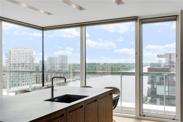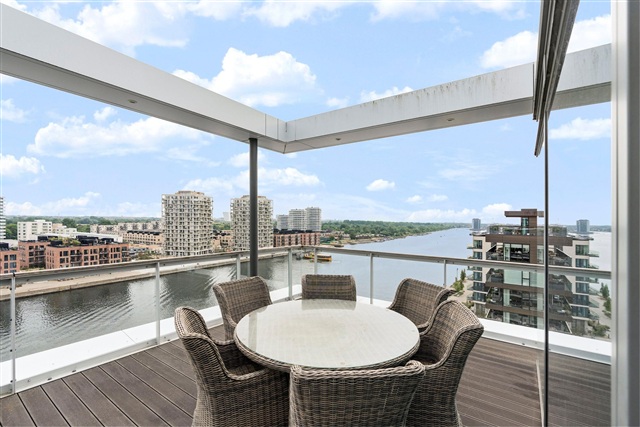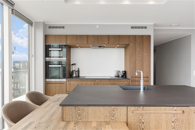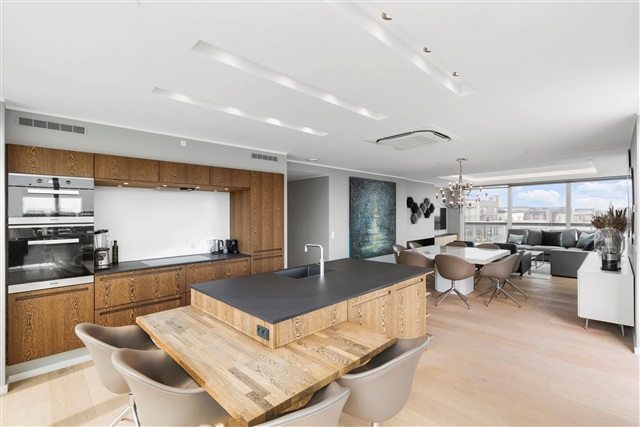 At the far end of the hallway, the impressive kitchen and dining area stands out with exquisite materials and an extravagant design that seamlessly connects to the front-row roof terrace, showcasing one of the finest views in Copenhagen - simply breathtaking. The apartment is available, subject to agreement, with the furnishings seen in the photos. Included in the offering is a private parking space situated in the underground garage. For additional details or to arrange a viewing, please contact directly.