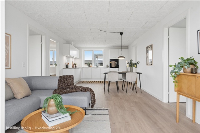Experience a walkthrough of our 4-room show home spanning 85 m² through the video below - enjoy! This contemporary residence covers 75 m² and combines functionality with a serene atmosphere amidst green surroundings. Every square meter is thoughtfully utilized, offering a living space suited for both peaceful everyday life and pleasant social gatherings.At the core of the home lies a spacious kitchen and living area arranged in an open-plan design, providing ample room for dining and lounging. Large windows flood the space with natural light, creating an airy environment that brings the outdoors inside. The master bedroom accommodates a double bed along with built-in wardrobes, while the generous bathroom features modern fixtures and includes a laundry column for added convenience. Upon entering, the hallway warmly welcomes you and leads further into the living quarters, where you will also find a storage room adjacent to the kitchen-ideal for keeping essentials organized.