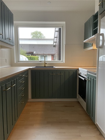 Kitchen in connection with living room, bedroom, bathroom with bathtub and shower, room, hallway and utility room.