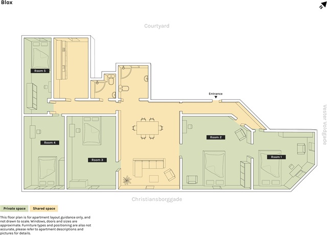 This cozy apartment has a total of five rooms, with two couple rooms and three single rooms. In the middle of the apartment is the central point for all flatmates. This big room has both the living room and dining room, making it the perfect place to gather people, socialise and watch movies together after a great dinner. There are two bathrooms, both with showers right next to each other. The kitchen has a modern touch and is spacious enough for several people to prepare food simultaneously.