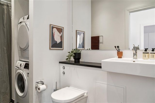 - The bathroom is fitted with elegant fixtures, a washing machine and a dryer—ideal for longer stays or families traveling with little ones.