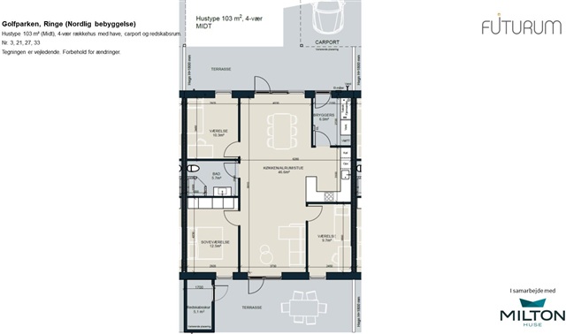 Extremely modern and well-appointed townhouse with entrance hall/utility room, bright kitchen in open connection to the dining area and cozy sofa corner. From the family room there is access to the two terraces on either side of the house. Furthermore, there are two good sized bedrooms, a bedroom with a fixed closet wall and a spacious bathroom. The house has its own tool shed and carport.Garden: Private garden and terraceOutbuildings: Storage room 7m²Parking: 2 parking spaces - 1 with carportAll consumption is settled directly to the utility companiesOpen and bright townhouseThe houses are bright and friendly with large windows and glass sections that allow plenty of natural light throughout, as well as white, smooth walls and ceilings throughout.Light floors in the kitchen/living room, living room and bedrooms of laminate as oak planks. Entrance hall, utility room, bathroom and shower are finished with large, beautiful tiled floors in dark gray.All doors are finished in smooth white with stainless steel handles and without doorsteps for optimal access. Window frames are bricked and water-scoured in white. Walls facing the floor are finished with smooth white skirting boards.Terraced house with fine detailsKitchen, bathroom, utility room and bedroom are fitted with modern HTH modules in smooth white finish with stainless steel handles. Practical laminate worktops in rustic slate color with spacious steel sink. Splashback behind cooking section for easy cleaning. Bathroom sink in molded material. Floor-mounted toilet from Ifö Sign, quality fittings from German Hans Grohe and line drain in the shower.All appliances are included in recognized quality, including a cooking section, oven with pyrolysis technology and fridge/freezer. There is a washing machine and dryer in the utility room, which the tenant brings himself.Lighting installation with spotlights in the bathroom and utility room and spotlights in the kitchen cabinets.There is underfloor heating throughout the townhouse, which is controlled via separate wireless thermostats in all rooms. The home is equipped with ventilation systems that ensure a healthy and good indoor climate.Outside, there is an electrical outlet, faucet and lamp by the entrance door.Electricity and water consumption is settled directly between the tenant and the utility companies. Heating from district heating.Please note that model photos are used on this page. We reserve the right to make corrections.