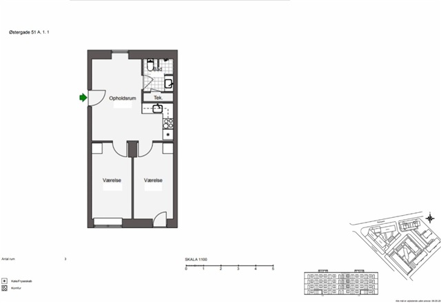 The building itself is a modern structure consisting of four floors and is situated in the heart of Odense C. It contains a total of 86 apartments that range between 45 and 97 square meters and offer two or three rooms. Most apartments include their own washing machine and dryer, while shared laundry facilities are available for those without in-unit machines. The courtyard features a playground as well as a pleasant, green setting for residents to enjoy.