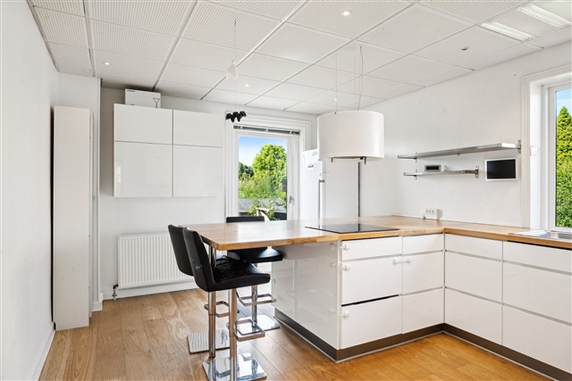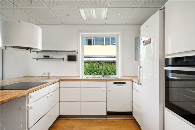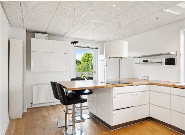 INTERIOR: Entrance hall with space for shoes and outerwear. From here there is access to a hallway that leads you to the rest of the house. The house has a dining kitchen, living room, bathroom and two bedrooms. The dining kitchen has good cupboard and work space. It is a beautiful kitchen in white, handle-free elements and a wooden tabletop. The living room is spacious and there is room for a dining table and sofa arrangement. From the living room there is access to a large terrace where there is sun all day. The two bedrooms are a really good size, where there is space for a bed, cupboard and possibly a desk if needed. The bathroom is also in good condition, with a separate shower, bathroom furniture and toilet. The basement is dry and has high ceilings. Here is a good and practical laundry room and two large available rooms, which are very useful for almost everything. Outdoors there is a large lawn for ball and play and an easy garden. This is located to the west and you will be able to enjoy the sun until it sets. Definitely worth a look.