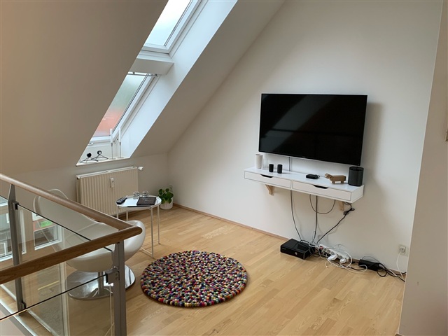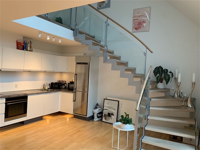 On the ground floor you will find a spacious and bright kitchen-dining room with plenty of space for a dining table. There is also a good bedroom on the ground floor. The kitchen is fully equipped with a fridge/freezer, built-in oven, hob, extractor hood and dishwasher.