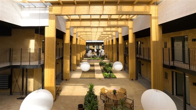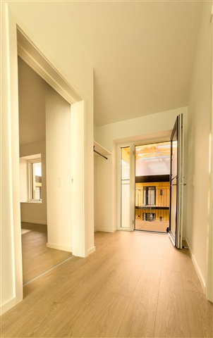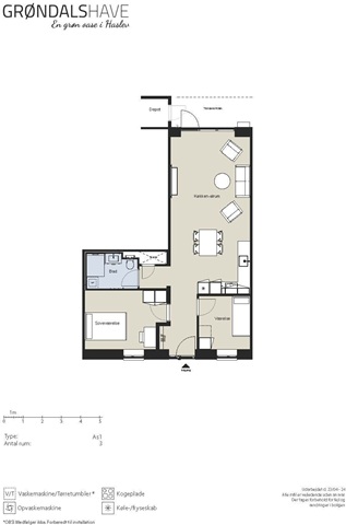 This inviting three-room apartment is located on the first floor and offers the convenience of an elevator. Upon entering, you find a hallway with wardrobe space and access to a guest room or office. Continuing through the apartment leads to a contemporary Svane kitchen adjoining a spacious living room, where a slight bend in the floor plan creates additional space and enhances natural light. The living room provides entry to the bedroom and extends onto a balcony that spans the entire width of the apartment, complete with a storage room. The bathroom is elegantly designed, featuring gray tiles, a generous shower area, and fixtures that match those in the kitchen.As a resident, you will benefit not only from a modern living space but also from access to charming communal facilities. These include a workshop, a guest apartment, a shared event room, and an atmospheric orangery, all set within a welcoming atrium courtyard that fosters a strong sense of community while offering a peaceful retreat in everyday life.