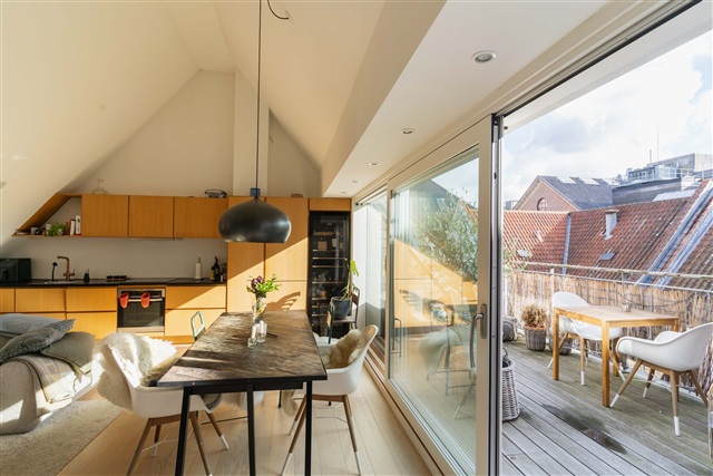 On beautiful Dybensgade in the heart of Copenhagen K, this lovely two-story apartment of 104 m² is for rent. The apartment offers two good bedrooms and a large, spacious bathroom.On the first floor of the apartment you will find a bright and inviting kitchen-dining room with plenty of space for both dining and living areas. From here there is direct access to a completely private, large south-facing roof terrace - perfect for relaxation, dinner parties or quiet moments under the open sky.