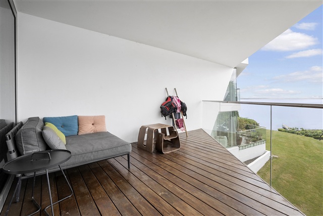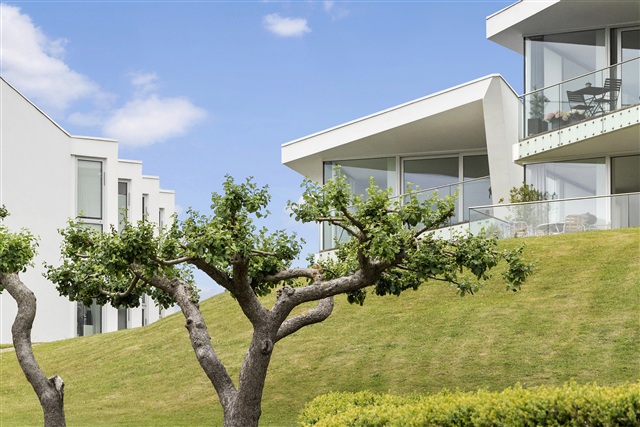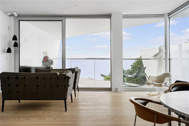 The interior design is uncompromising and made of some of the most exclusive materials on the market: full-length Dinesen Douglas plank floors with built-in underfloor heating create a warm elegance, and the stylish Multiform kitchen is open to the living room with access to a covered balcony. From here you get a panoramic view of the Øresund that simply has to be experienced.