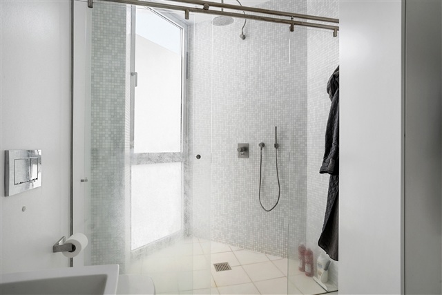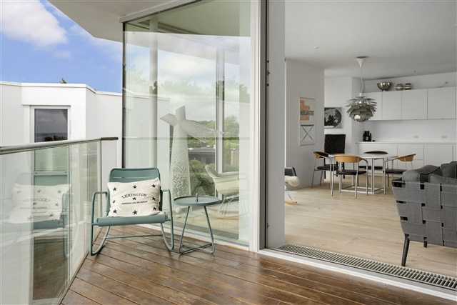 The 135 m² large owner’s apartment is located in an exclusive and architect-designed property, created by the award-winning Lars Gitz and built in 2010. The style is modern Scandinavian minimalism, designed with an eye for both functionality, light and privacy. The property contains just eight homes, divided into four buildings that rise like white sailing ships heading towards Sweden – an architectural icon on Strandvejen.