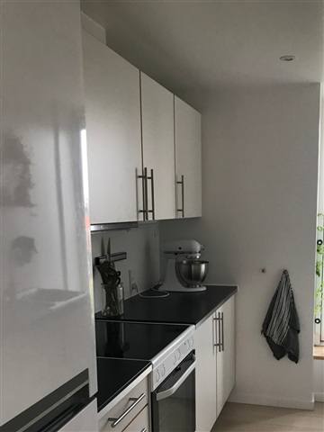 The kitchen is separate and designed in a modern, white design with a fridge/freezer, stove, extractor hood and dishwasher. The bathroom is decorated with black floor tiles, a separate shower and appears neat and contemporary.