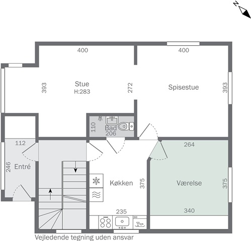 The apartment offers a spacious entrance hall, a bright and open living area with living room and dining room in continuation of each other, a regular bedroom with built-in closet and a functional and bright kitchen with good closet and table space.