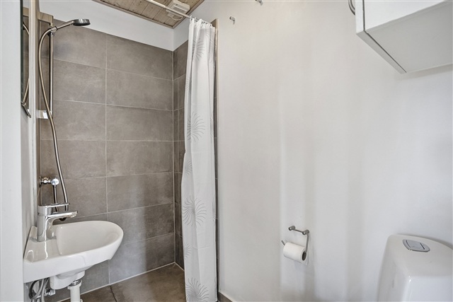 Modernized and functional kitchen with good table and cupboard space. Nice bathroom and shower cubicle at the back and tiles on the floor.