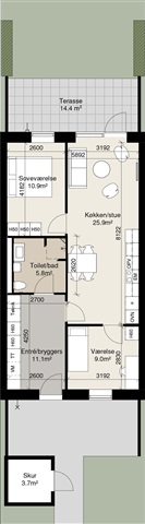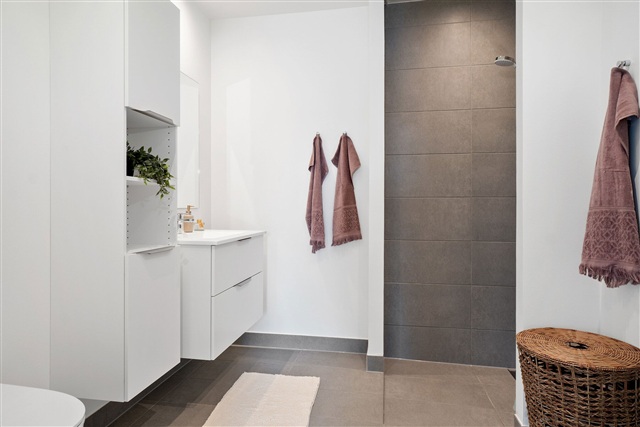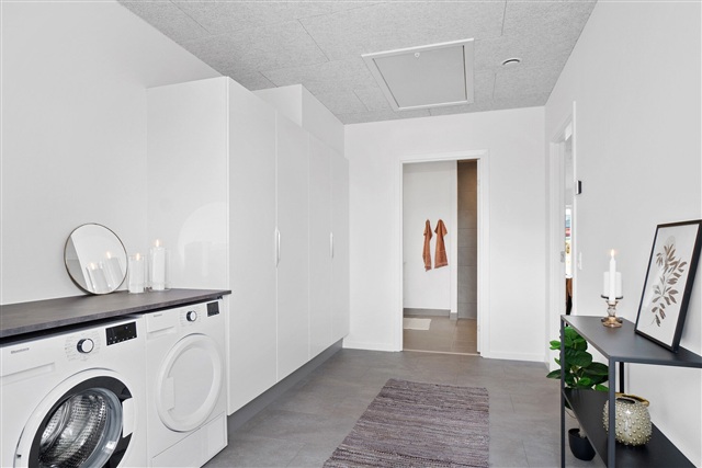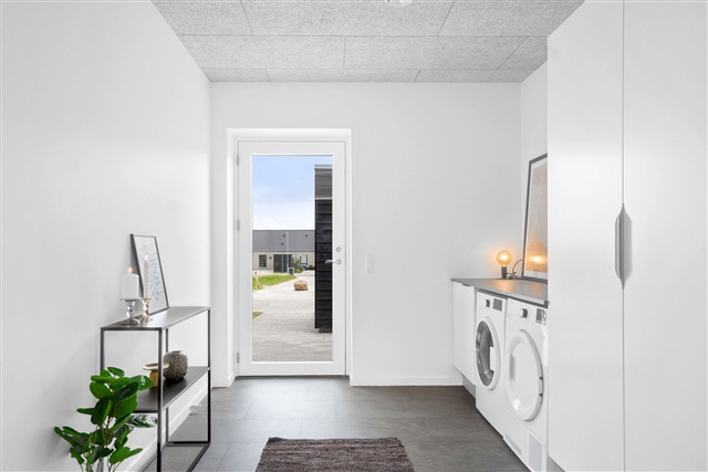 Sustainable three-bedroom townhouse with combined kitchen and living room in one, bedroom and a larger room, bathroom, entrance hall/utility room and inviting terrace. Kitchen-living room/living room The bright and modern townhouse contains a lovely kitchen-dining room with space for both a dining table and sofa area. The kitchen contains all white goods. The living room also has direct access to a lovely terrace that invites you to spend time outdoors. Rooms This home contains two good rooms that are approximately the same size. There are therefore several options for interior design. Both rooms have fitted wardrobes with storage space. Bathroom The home has a stylish bathroom that is built with timeless quality materials. Here you'll find everything you need: shower, toilet, sink and storage space. Entrance hall/brewery Enter the home through a bright and welcoming entrance hall. The entrance hall is fitted with practical cabinets and contains a washing machine and dryer. Outdoor space The townhouse has plenty of outdoor space. In front of the home, you'll find a tiled front garden with space for sitting and playing. This is also where you'll find a 4 m2 shed with space for bikes and extra storage. On the other side of the home, you can enjoy a private terrace that invites you to enjoy cozy moments under the open sky.