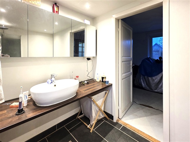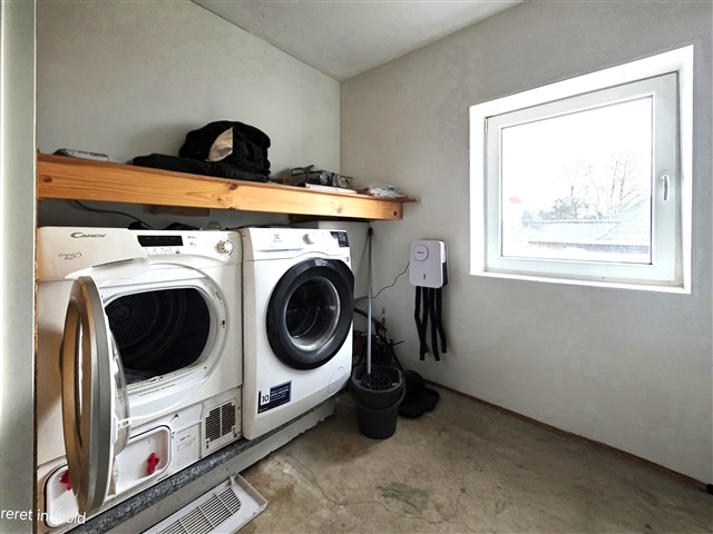 Part 2: Large entrance with entrance to laundry room with wardrobes, entrance to bathroom. In the very large kitchen there are stairs up to the 1st floor, where there is 1 living room and a good bedroom.