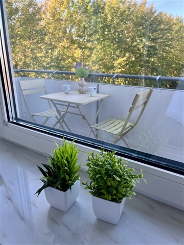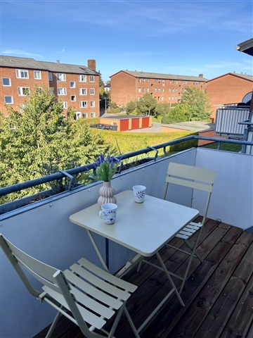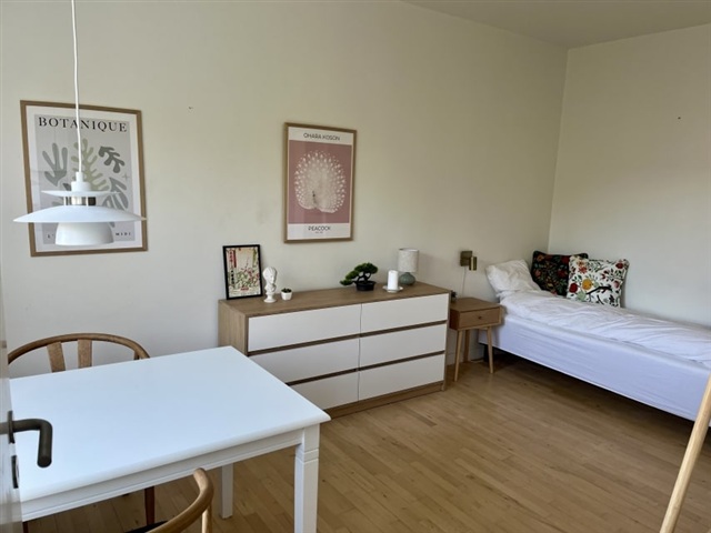 Lovely sunny and quiet 16 m2 room with shared balcony, newly renovated bathroom and view of cherry trees and green surroundings. Your cozy and bright room is furnished with a single bed, new dining table for 4, beautiful clothes rack, lovely shelves and lamps that can be dimmed.The apartment is close to Frb's cafes, the wild nature of Damhus meadow, Rødovrecenter's shopping options, the bus outside the door, large green garden with barbecue, chairs and tables.