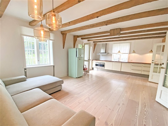 This charming semi-detached house on Bohlendachvej is spread over two floors and offers three bedrooms along with two gardens positioned on either side of the property, allowing for sun exposure throughout the day. The residence is situated in a historically protected building directly adjacent to the canal, and the street itself derives its name from the house’s distinctive roof. Within the home, original exposed beams and Dinesen plank flooring add character and authenticity. Homes of this nature are rare to find, so arranging a viewing promptly is advisable. The property is available for immediate rental with a lease term ranging from two to four years.Inside, you’ll find an entrance hall with space for outerwear and a pleasant bathroom featuring a shower. Beneath the staircase, a washing machine and dryer are conveniently located. The spacious open-plan kitchen and dining area connect directly with the living room, opening via large terrace doors onto the garden that faces the canal. On the ground floor, there are also two generously sized bedrooms as well as a walk-in closet. Upstairs, a large bedroom of approximately 50 square meters boasts vaulted ceilings; like the rest of the house, it includes exposed beams and multiple Velux windows that bathe the space in natural light.