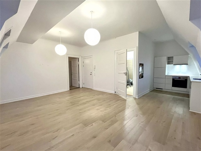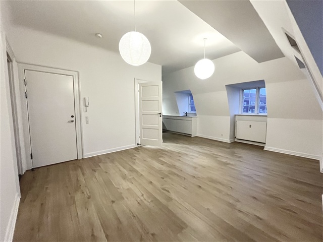This bright and contemporary one-bedroom apartment is situated on the second floor of a historic courthouse building right in the heart of Horsens at Rådhustorvet. Offering a blend of classic charm and modern conveniences, it provides a spacious bedroom and a large, sunlit living room, creating a comfortable and inviting living environment.The kitchen has been recently updated and comes fully equipped with essential appliances including a dishwasher, a refrigerator/freezer unit, an oven, and ceramic cooktops. The bathroom is also modern, featuring a walk-in shower, underfloor heating, and space allocated for a washer and dryer setup to simplify daily routines.