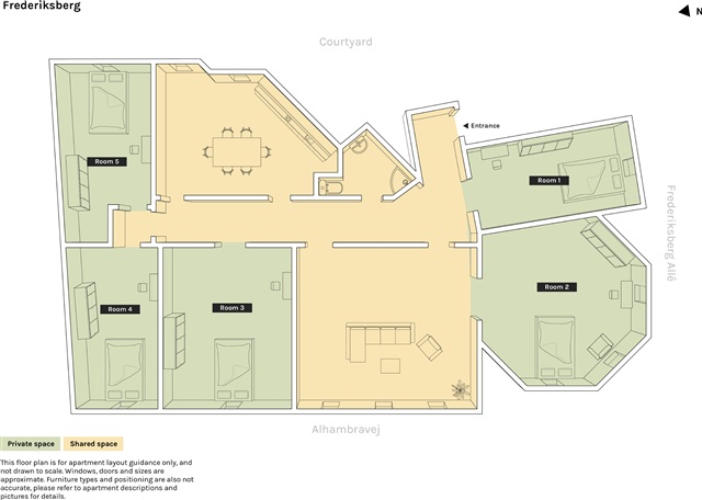The apartment is located in Frederiksberg, a municipality different from Copenhagen but in the same area. This cute apartment is on the ground floor of a beautiful and restored old building from 1872. The street of the apartment is historically known, dating back to the 1700. It was originally used as the kings private road leading to his new summer residence, Frederiksberg Palace. Today it is a famous street used for big events, like pride parade, bike races, half-marathons, and royal celebrations. The cozy apartment is located on the second floor, giving it lots of light during the day. There are in total four single rooms. What is unique about this apartment is that it also has a separate guest room, making it perfect to have guests visit. The big kitchen has a high-raised dining table that can sit around 7-8 individuals. There is one bathroom with a shower. The spacious living room provides comfort and ability to host dozen of people. With a big TV, it is perfect for movie nights and relaxed evenings. Nearby the apartment is the Copenhagen Zoo as well as the popular park: Frederiksberg Have (Garden). Various concerts and festivals are held here annually. Moreover, the street known as “the Paris of Copenhagen” is located two streets down, where there are various boutique shops and cafes.