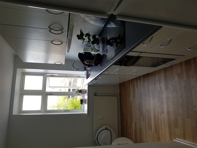 The bedroom has built-in cupboards and appears bright and calm, while the bathroom is practically furnished with a separate shower and plenty of storage space.