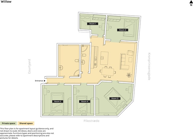 This apartment on the top floor (3rd floor), is the perfect apartment for a social animal who enjoys cooking, relaxing and having a good time surrounded by people. The apartment contains five bedrooms, four very spacious one, and one a bit smaller. You will be pleasantly surprised by the sheer size of the bathrooms, where you can experience a sense of true space and serenity. The kitchen opens up to the lounge area containing both an eating area as well as a living area. The apartment is very bright with beautiful light sources and high ceilings. The apartment is located in the heart of the city center, surrounded by restaurants, bars and design stores. If you like to be at the center of it all, this place is perfect for you. The apartment is a 5 min walk to the King’s Garden, where the locals spend the whole summer gazing into the sky whilst enjoying the sun with friends on the grass. The King’s garden is also where the Rosenborg renaissance castle is located, where you can experience 400 years of royal history. It is home to the crown jewels and was originally built as a country summerhouse in 1606 and is an example of Christian IV’s many architectural projects. The name Pilestræde meaning willow strait, is believed to derive from the willow and gardens that lay in the area, specifically the cemetary at St. Nicholas church where willow trees grew, which was used as a tool to fence the gardens. At the end of the present street, lay a breeding farm in the 16th century where the city bull stood stabled. Pilestræde was lucky to not be affected by the city fire in 1795 and the city bombing in 1807. The street is one of the oldest in the medieval town.