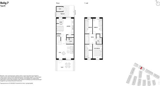 Modern terraced house with garden to the south-west Well laid out terraced house on 2 levels with parking - and charging stations - right outside the door. From the entrance terrace in front of the house, you step into the wind trap, which is directly connected to the heart of the home, the kitchen-dining room. The ground floor also contains a toilet and a cozy living room. From the living room there is access to the garden, which, with its location to the south-west, gives you many hours of sunshine, while also being close to the neighbourhood's large green communal area. On the first floor you will find the bathroom and four good bedrooms, two of them with extra high ceilings.
