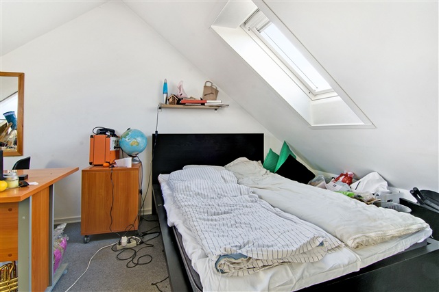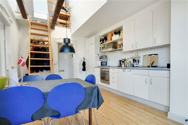 On the top floor of the building, you will find this unique and charming apartment with a fantastic view over the city’s rooftops. Perfect for couples, friends, and small families who desire a bright and characterful home in Aarhus C.The apartment has an open and inviting living space with a high ceiling in the kitchen, featuring a skylight and exposed beams. The kitchen is sleek and functional with ample storage and all essential appliances, including a fridge-freezer, stove, and dishwasher. Additionally, the apartment offers a spacious bedroom on the main floor and another bedroom on the upper level with slanted ceilings and enough space for both a bed and wardrobe.From the bedroom, there is direct access to the property's cozy communal courtyard, where residents can enjoy peaceful moments and warm summer days. Additionally, there is access to shared laundry facilities, bicycle parking, and a storage room in the building's basement.