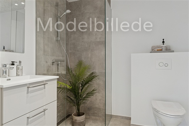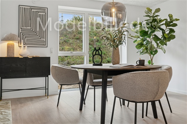 Two-storey townhouse, which on the ground floor contains entrance hall, toilet with washing machine and dryer, kitchen family room with corner kitchen, plenty of space for dining table and the possibility of furnishing a cozy sofa corner. On the 1st floor, via a good and large staircase, you will find a larger bedroom with three built-in wardrobes, bedroom and bathroom. There is a depot/storage room in connection with the stairwell. From the family room on the ground floor there is access to a large terrace behind the house.