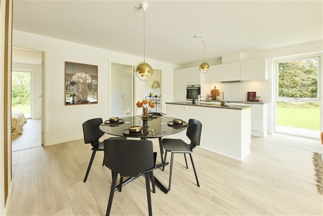 High-quality materials and thoughtful amenities make day-to-day living comfortable and convenient. The kitchen showcases timeless light tones and sleek lines, fully equipped with integrated appliances. Durable light-colored flooring extends throughout the living spaces, while the entrance, utility room, and bathroom are fitted with tiles. Underfloor heating covers the entire property, supported by efficient ventilation systems. Well-planned lighting complements the bathroom, utility room, and kitchen, enhancing the home's pleasant atmosphere.