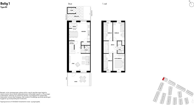 Newly built terraced house with garden to the south-west Well laid out end terraced house on 2 levels with parking - and charging stations - right outside the door. From the entrance terrace in front of the house, you step into the wind trap, which is directly connected to the heart of the home, the kitchen-dining room. The ground floor also contains a toilet and a cozy living room with access to the garden, which with its location to the south-west gives you many hours of sunshine. On the first floor you will find the bathroom and four good bedrooms - two of them with extra high ceilings.