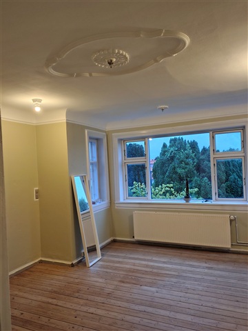 Bright and inviting villa apartment with access to an atmospheric garden with old fruit trees. New kitchen. Two living rooms en suite (currently separated into two separate rooms) with bay window/windows facing South/West. 1 room with window facing West/North. District heating. Freshly painted. Easy access to Copenhagen. City center via public transport or bicycle. Not a shared apartment. Gardener/stair cleaning fee is added.If you want to read the description in its original language that is also possible. Read original description