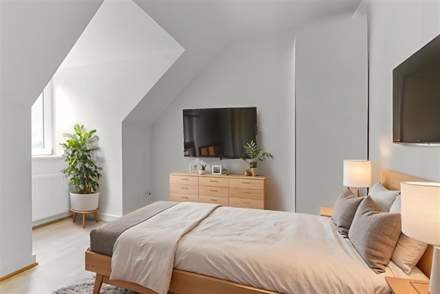 Welcome to a ready-to-move-in apartment with a pleasant, bright atmosphere and charming sloping walls. The layout is functional with an entrance hall, large living room, bedroom, separate kitchen and a spacious bathroom. The apartment is located in the attic, which gives a calm expression and nice views of the tree crowns through both windows and skylights. The living room is the natural gathering point of the apartment with plenty of space for both a sofa and dining area or a small home workspace, depending on your needs. The light floors and white walls make it easy to decorate personally, and the sloping ceilings create a cozy atmosphere without compromising on usability. The bedroom is regular with a window, radiator and wardrobe, and there is space for a double bed and storage. The kitchen is separate with classic, white elements, good table space and a practical tiled back wall. Here you get a skylight above the work surface, extractor hood, stove with oven and under-counter refrigerator - a bright and functional room for everyday cooking. The bathroom is larger than you often see in this size of home andhas both a window for daylight and natural ventilation, a shower area, toilet and