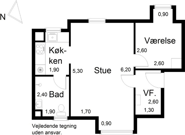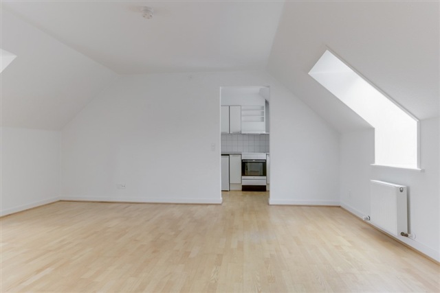 Lys 2-værelses på 61 m2 i tagetagen med skråvægge, separat køkken og rummeligt bad