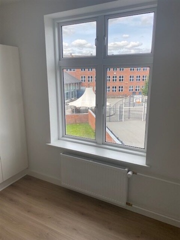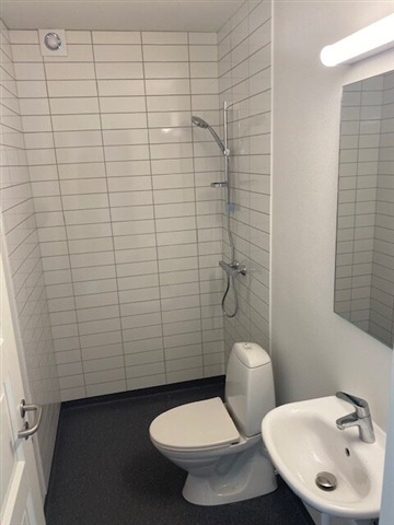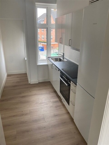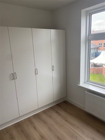 This recently built three-room rental apartment is conveniently located near the city center and shopping areas in a pleasant neighborhood of Haderslev. The residence spans 101 square meters and includes an entrance hall with a distributor corridor, two living rooms separated by a door, a kitchen equipped with a full range of built-in appliances, a small connecting corridor leading to a white-tiled bathroom, and a bedroom with built-in wardrobes.The rooms are bright and airy, benefiting from a generous ceiling height. Shared laundry facilities are available in the basement, used by two other tenants, and there is access to a communal garden as well as a large private storage room.