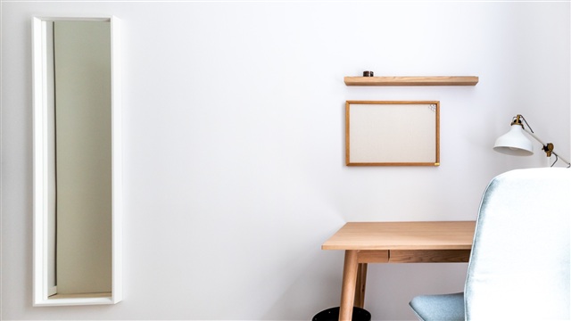 Curtains, mirror, laundry basket, trash can, rugs and decoration