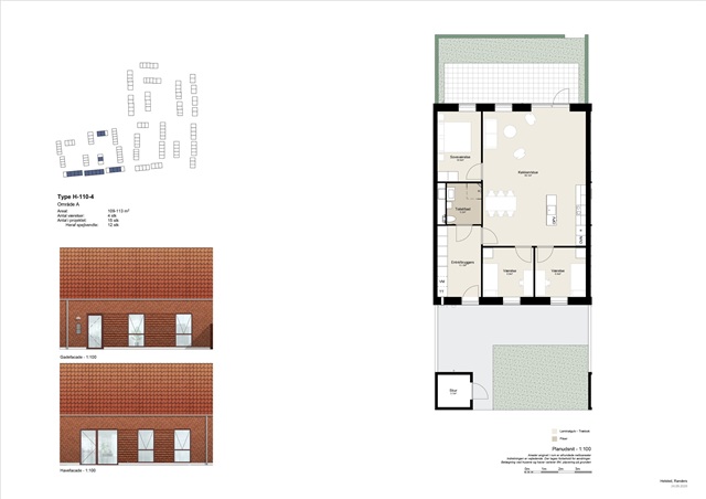 Description of the home - 110 m²Kitchen and living roomIn this lovely home, you can enjoy a large and bright kitchen-living room where no space has been spared. In addition to the bright and modern kitchen, which includes all appliances and a smart kitchen island, there is plenty of space for a dining table, living room and play area. The large windows and the patio door with open access to the terrace ensure the room is flooded with light.RoomsThe home has a large master bedroom and two good-sized children's bedrooms. All rooms are furnished with fitted wardrobes. The two children's bedrooms are located side by side at one end of the townhouse, while the master bedroom is located at the opposite end of the home.Utility room and bathroomThe practical utility room contains everything you need for everyday practicalities; washing machine, dryer and a smart sink to keep the dirt out of the rest of the home. From the utility room, you also have access to the bathroom, which is equipped with a shower, toilet and sink with smart storage solutions.Outdoor spaceThe home comes with a large and private tiled terrace that invites you to enjoy cozy moments outdoors. There's room for garden furniture, a barbecue and plenty of space for outdoor play. There is also a private tiled area in front of the home that invites you to stay and play, as well as a practical storage shed.