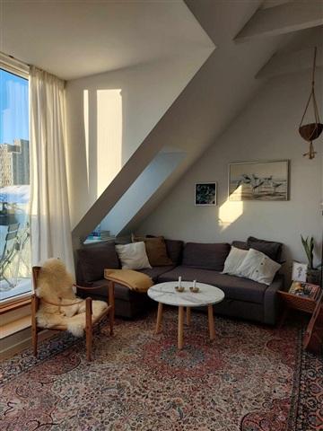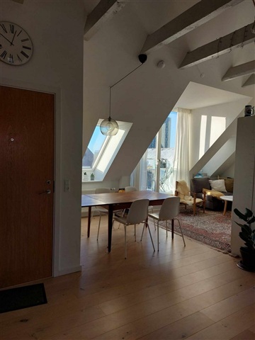 This charming 2-bedroom apartment offers a fantastic balcony and a unique living room with beautiful ceiling beams, which gives the home lots of character. The spacious living room has plenty of space for both a dining table and a sofa corner and appears bright and inviting.