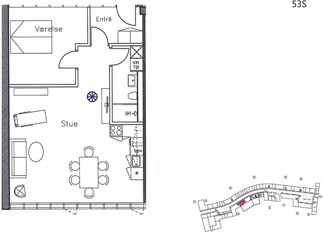 This residence features a spacious entrance hall equipped with built-in closet space, leading directly into a cozy kitchen-dining area. The open-plan room comfortably accommodates both a dining table and a seating arrangement. The kitchen itself is designed with white cabinetry and provides ample storage. The property also includes a well-sized bedroom and a bathroom fitted with a shower.Situated on the first floor of Egedals Centeret, all units enjoy convenient access to shopping and everyday essentials. Complimentary parking is available on both sides of the shopping center, adding ease for residents and visitors alike.
