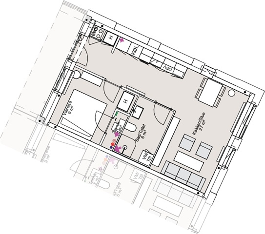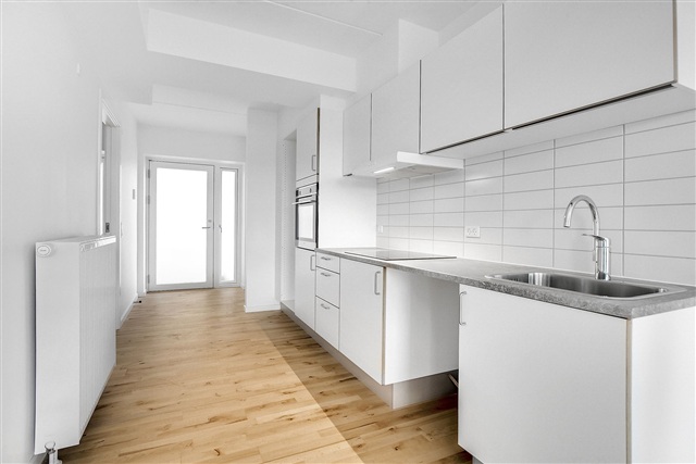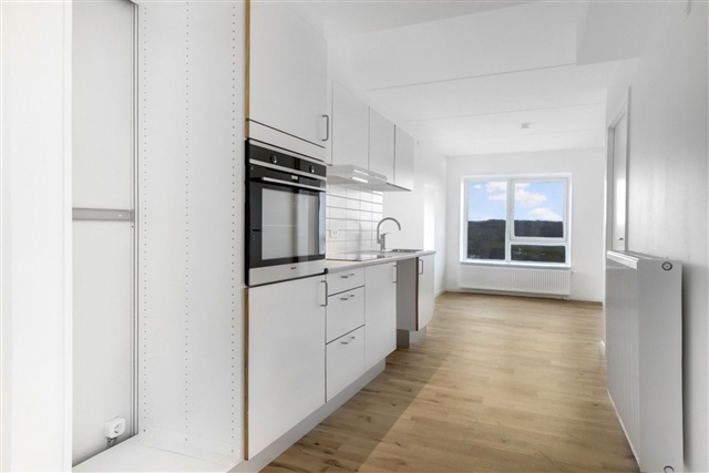 This move-in-ready two-room corner apartment features large living room windows that fill the space with natural light. The layout is straightforward and practical, beginning with an entrance hall that leads into a bright kitchen and living area combined. The kitchen boasts a modern, timeless design with white cabinetry, light-colored tile backsplash, ample storage and countertop space, as well as built-in oven, hob, and extractor hood. There is ample room for a dining table adjacent to the kitchen, along with a versatile living area suitable for sofa and TV setup.The bedroom is generously sized, equipped with built-in wardrobes, and offers enough space for both a double bed and additional storage solutions. The bathroom has warm-toned tiled floors, a separate shower enclosure with glass partition, wall-mounted toilet, a large mirror surface, convenient cabinet storage, and underfloor heating. Furthermore, there is prepared plumbing for a private laundry column with washing machine and dryer, allowing for in-home laundry facilities.