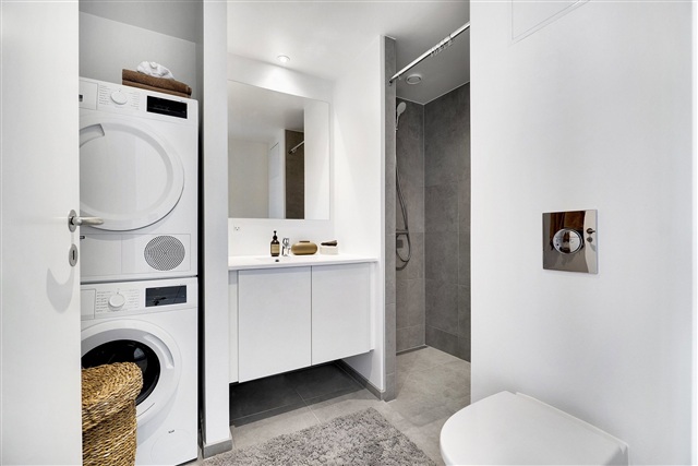which contributes to a luxurious expression to the bathroom. Furthermore, the bathroom is equipped with a washing machine and dryer.