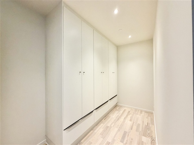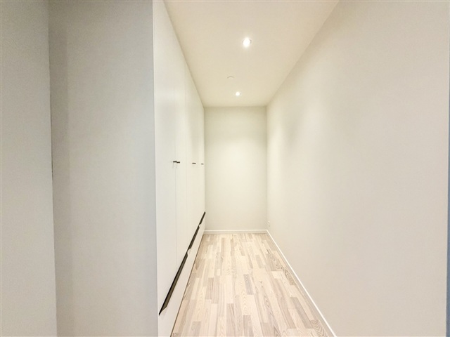 The elegant, sizable bathroom is tiled and offers underfloor heating, a wall-mounted toilet, a shower enclosure, and convenient access to a private washing machine and dryer. The main bedroom is large and includes a walk-in closet as well as expansive panoramic windows that provide stunning views of the harbor. There is also a well-proportioned second room suitable as a child's bedroom or home office, complete with built-in closets.
